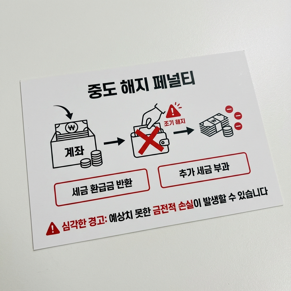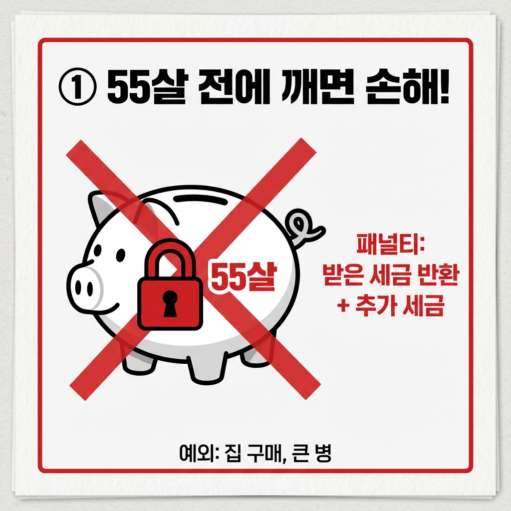 IRP계좌란 55살까지 못 꺼내요. 중도 해지하면 받은 세금을 다시 토해내고 추가 세금까지 내야 해요. 예외는 집 살 때, 큰 병 걸렸을 때만 가능해요.