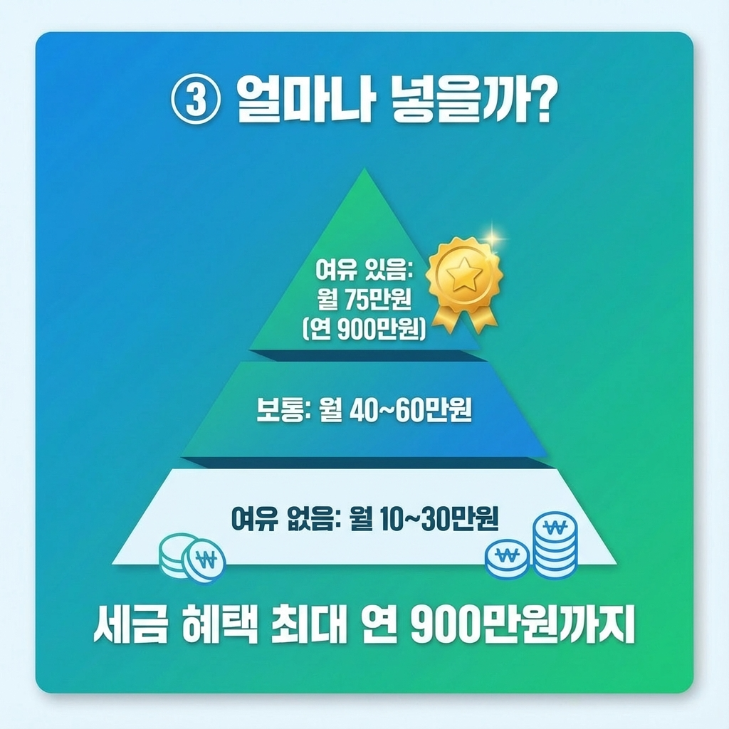- 여유 있으면: 월 75만원 (연 900만원 풀 채우기)