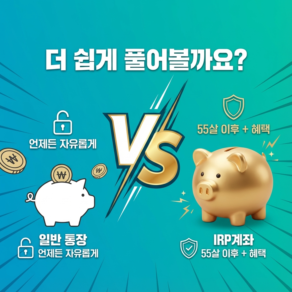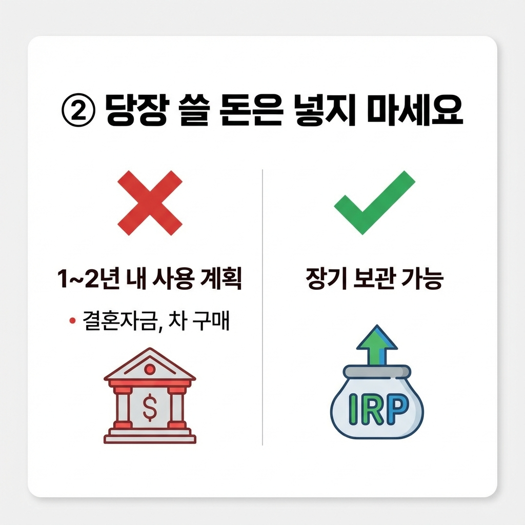 1~2년 안에 쓸 돈(결혼자금, 차 살 돈)은 일반 통장에 두세요. IRP는 "진짜 오래 안 쓸 돈"만 넣으세요.
