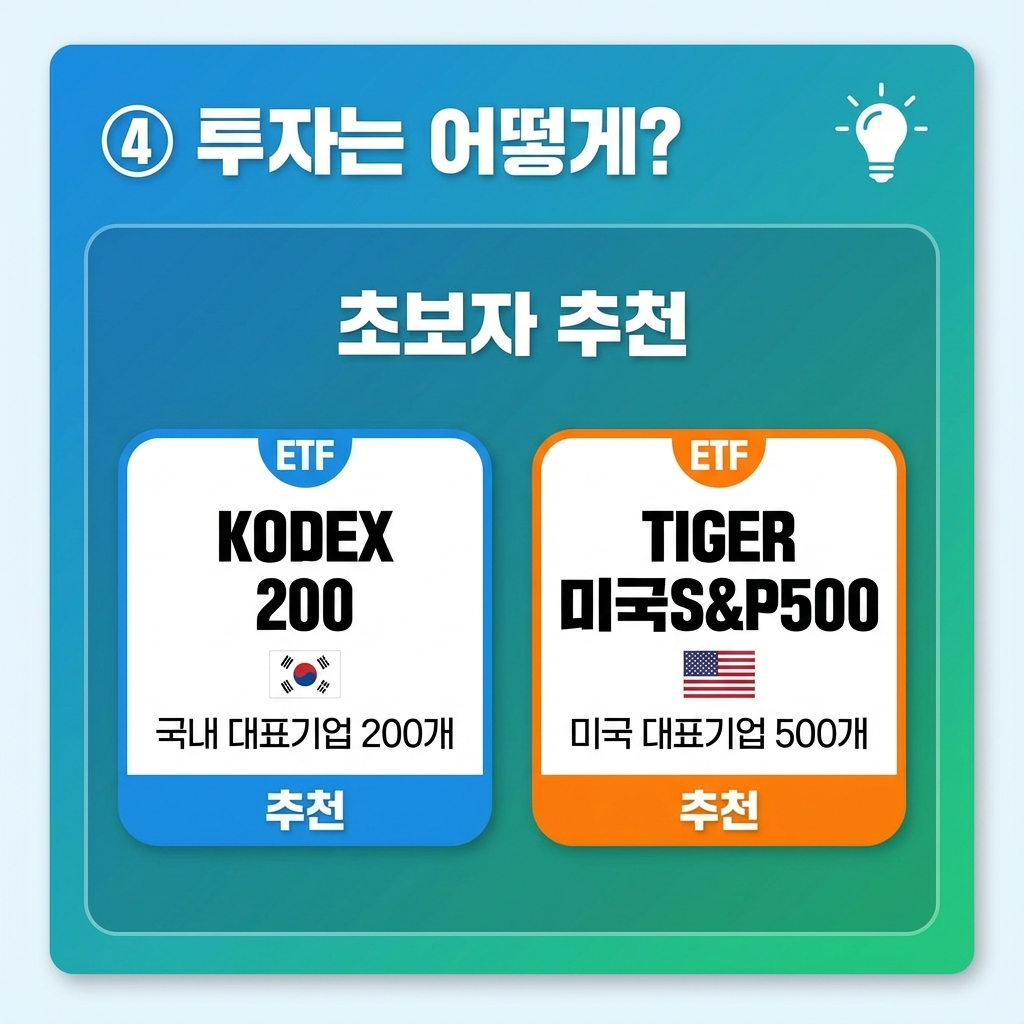 초보자 추천: KODEX 200 (국내 대표기업 200개) 또는 TIGER 미국S&P500 (미국 대표기업 500개) ETF를 사서 장기 보유하세요. 매일 확인 안 해도 되고, 10~20년 두면 알아서 불어나요!