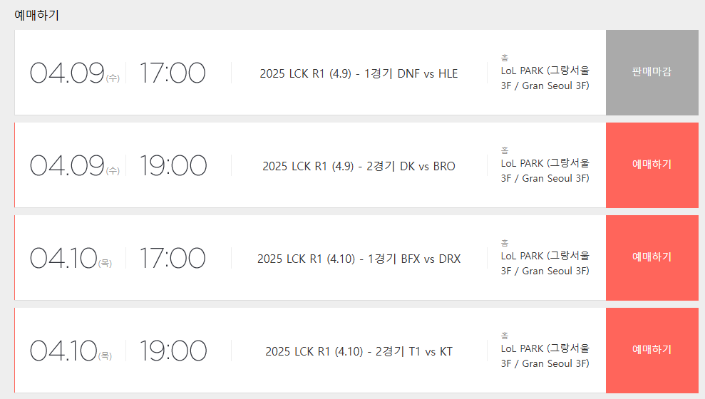 LCK 경기를 현장에서 직접 관람하고 싶다면 LCK 티켓예매는 필수입니다. 2025 LCK 티켓예매는 인터파크를 통해 진행되며, 경기 48시간 전부터 예매가 가능합니다.