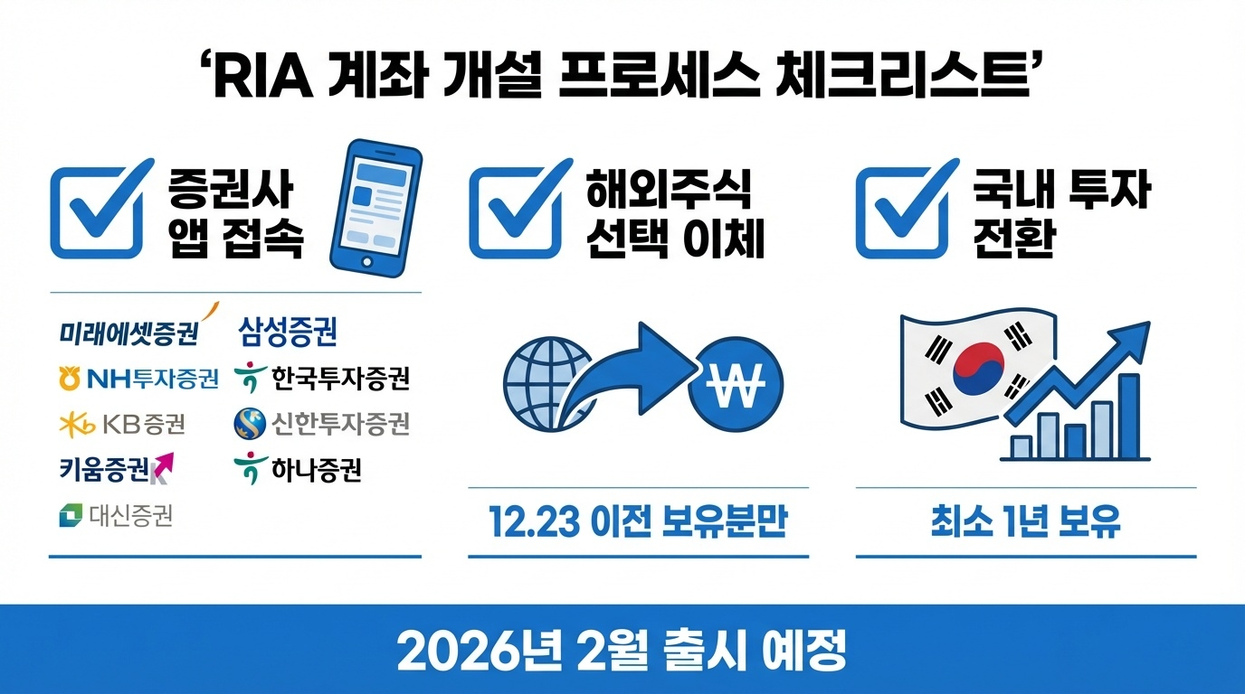 RIA계좌(국내시장 복귀계좌, Reshoring Investment Account)는 해외주식 투자자가 보유 중인 해외 주식을 매도한 뒤, 그 자금을 국내 증시에 1년 이상 투자하면 해외주식 양도소득세를 감면해주는 특별 계좌입니다.