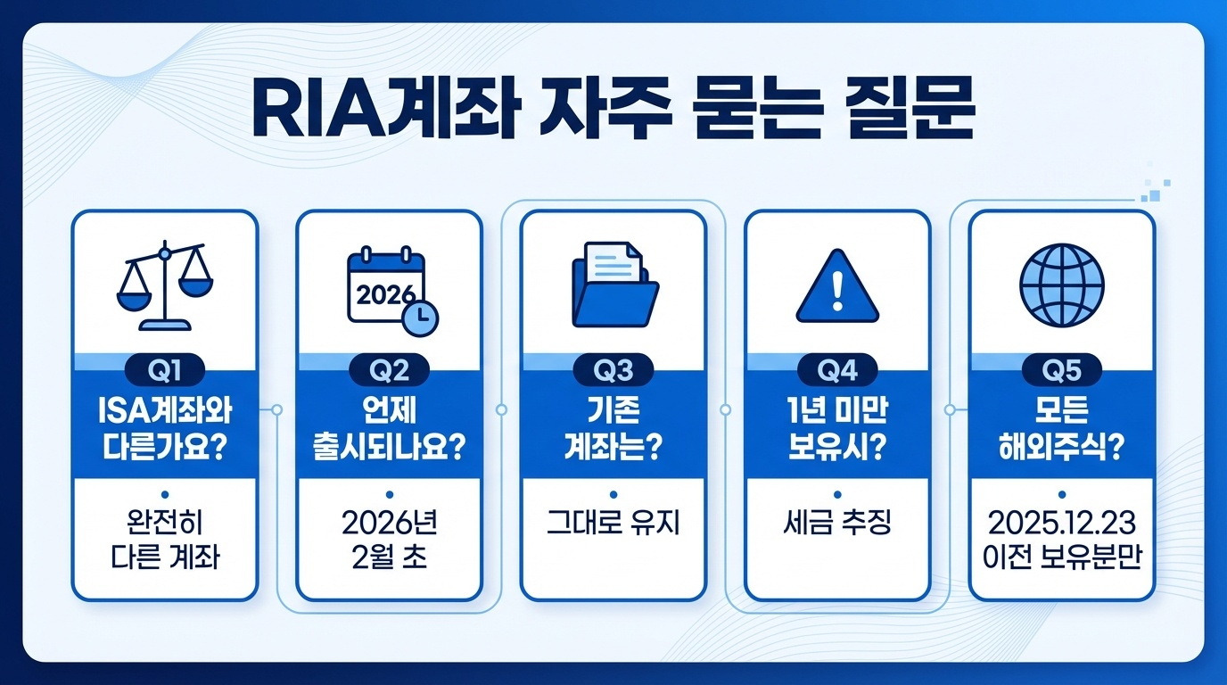A. 네, 완전히 다릅니다. ISA계좌는 국내 금융상품 수익에 대한 비과세·분리과세 혜택을 주는 계좌이고, RIA계좌는 해외주식 양도세 감면에 특화된 한시적 계좌입니다. 두 계좌 모두 개설 가능합니다.